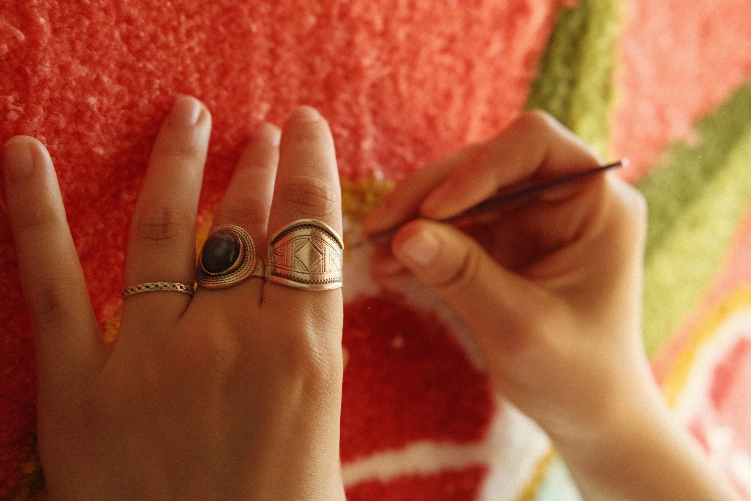 Costumière de formation, mais aussi illustratrice, je me suis tournée vers le tufting*, pratique à la rencontre entre mon univers créatif et mon intérêt pour la matière textile.